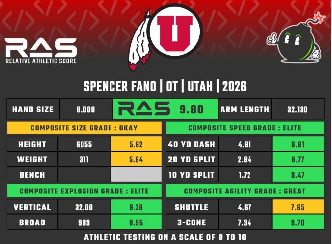 The Utah man blew everybody away at the Combine with his silky smooth maneuvers as he danced his way though every drill as he posted a 9.80 RAS score which ranked 33 out of 1606 OT from 1987 to 2026. He was “green” in the vertical and broad jumps, as well as the 3-cone and in every aspect of the 40 yard dash. Only his height, weight and shuttle prevented him being a history-maker.